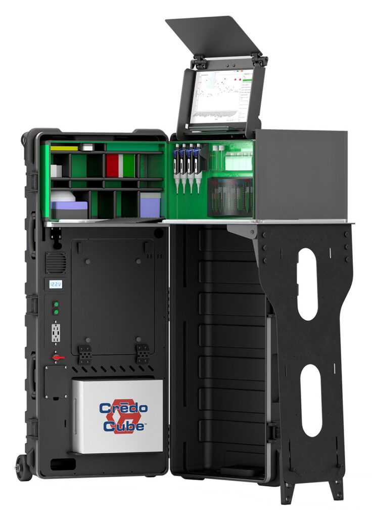 Mercury Lab is a single, lockable, grab-and-go case that can be wheeled through an airport and checked as luggage, thrown in the back of a pickup truck, or even strapped to the back of a motorbike. It can be set up on site in a few minutes, and be packed up just as quickly. It includes power management architecture, cold-chain storage, computational capacity, a stable workbench, biohazard waste disposal strategies and more. Mercury Lab brings a fully operational laboratory to the sample.
