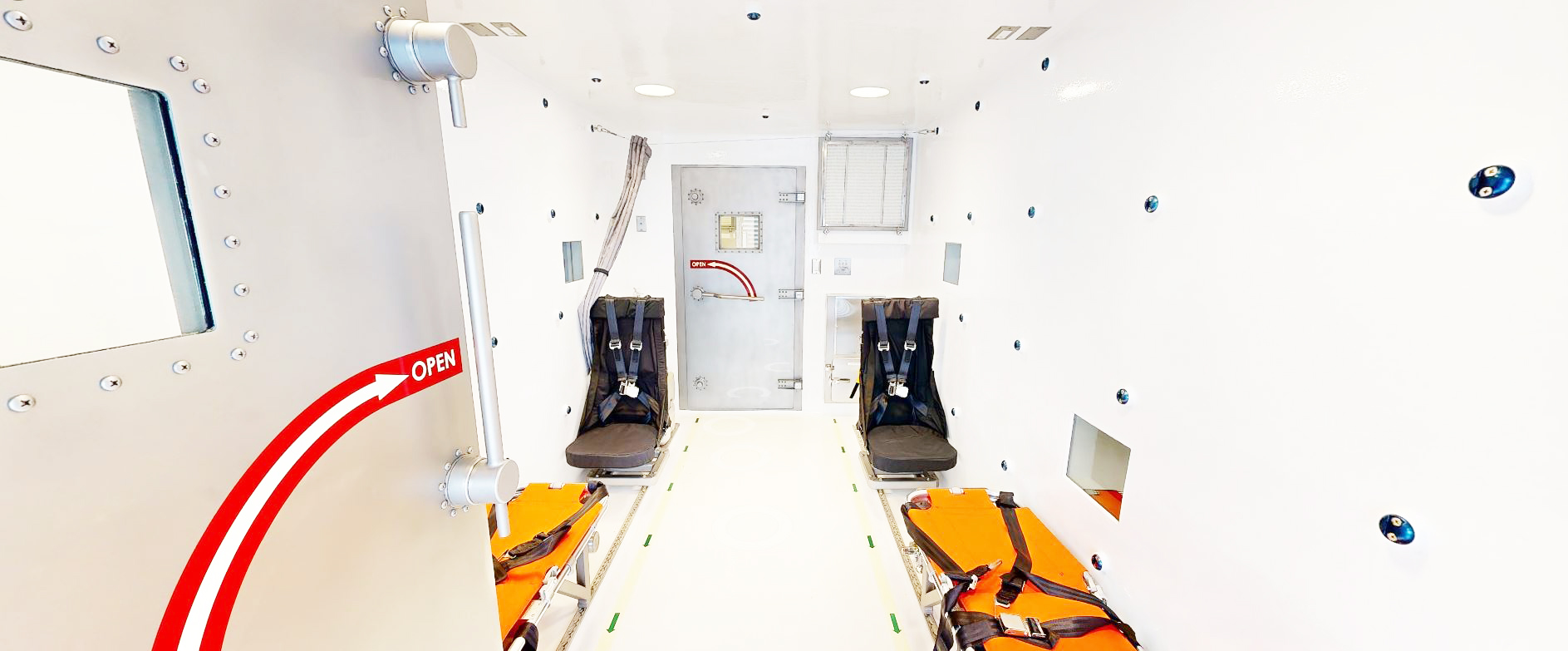 Unit has a separate patient room, medical staff room, and anteroom. Entire system is held negative to the cargo bay and all exhausted air passes through two-stage HEPA filtration to protect the transport crew